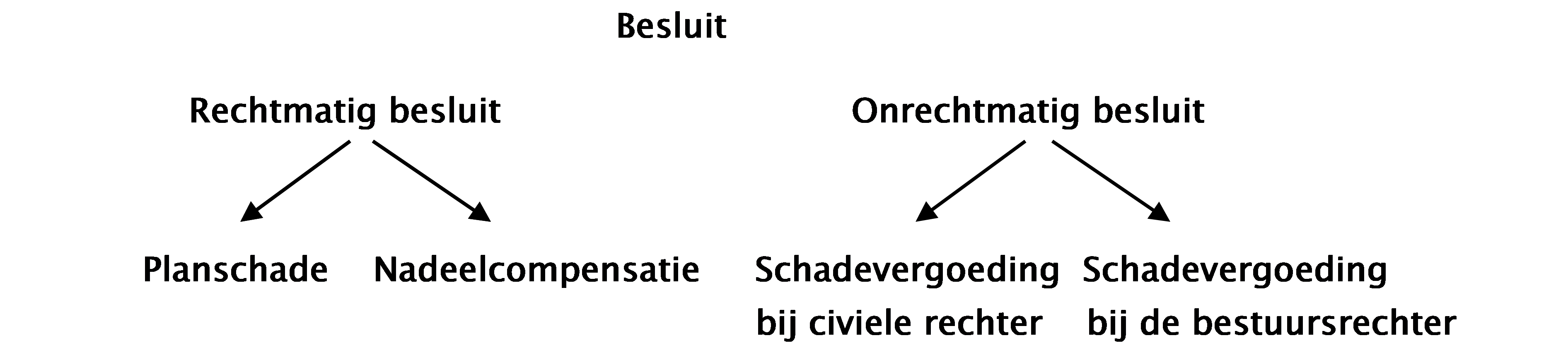 Ook de hoogte van de schadevergoeding verschilt bij een rechtmatig en onrechtmatig besluit. Ingewikkeld dus. Om inzichtelijk te maken welke procedures er zijn en welke procedure u moet volgen als u schade hebt geleden, biedt onderstaand stroomschema uitkomst: